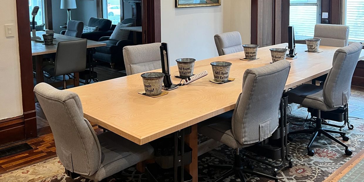 Two custom made solid wood tables are available on the main level of the Mill House for all your crafting needs. There are 10 stations complete with outlets and padded swivel chairs. Ironing boards, table lamps, and thread buckets are also provided.